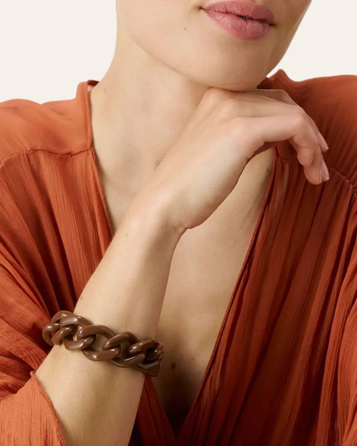 Chocolate never looked so chic! The Flat Chain Bracelet shines with its rich brown hue and chunky chain design. The golden clasp completes the look – a piece that’s fun, attention-grabbing, and adds a stylish accent to your outfit.