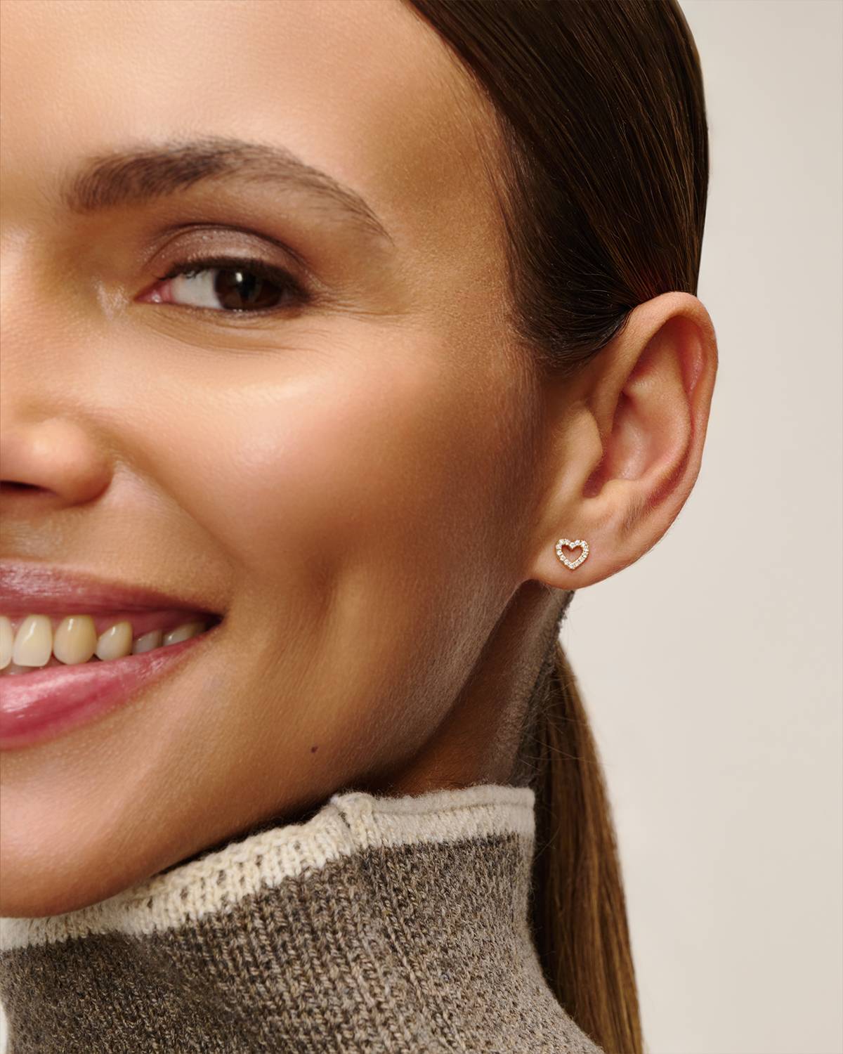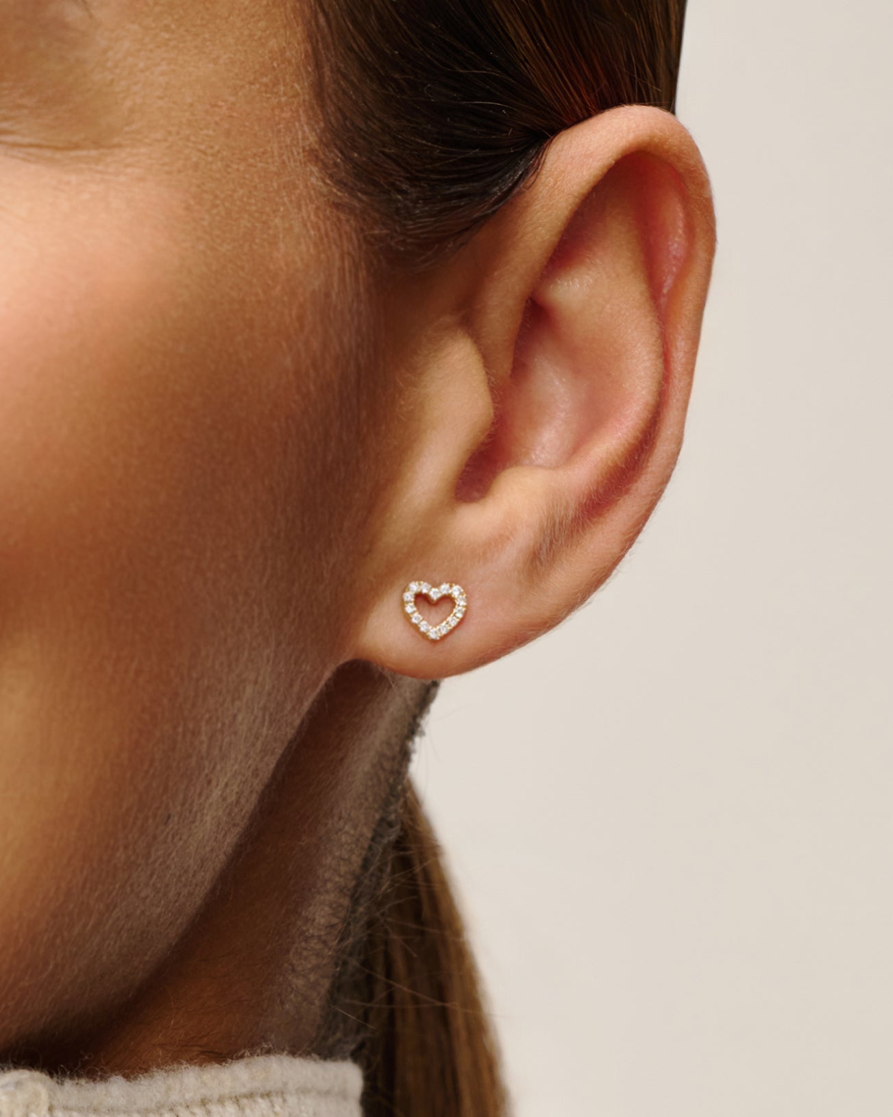 A sparkling statement of love! The Heart stud earring in 14ct real gold plating enchants with its open heart design framed by glittering diamond stones. The delicate balance of soft curves and luxurious shine makes it a modern classic with a playful twist – a piece that lights up every smile.