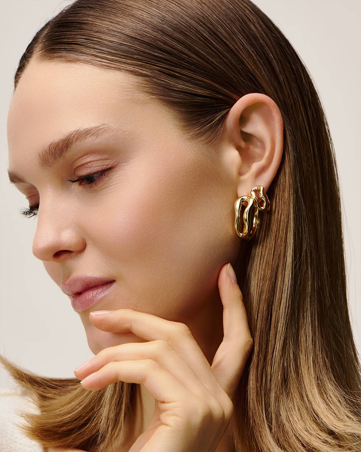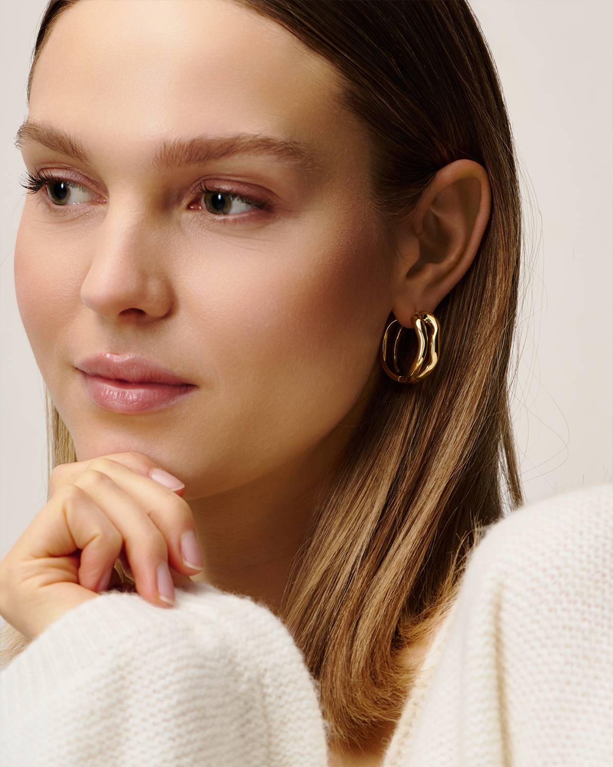 The Melina Sculpted Medium earrings by Pompidou redefine modern elegance. Their softly curved lines feel artfully molded – smooth, sensuous, and full of motion. The 18ct gold plating brings a warm, luminous finish that adds depth and character. A design with personality: classically inspired, creatively reimagined, and timelessly chic.