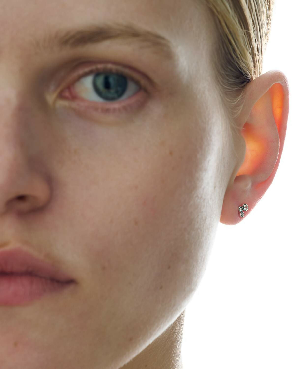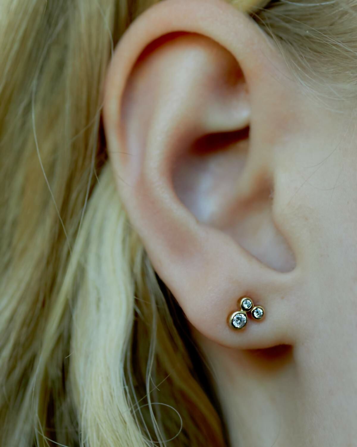 A pair of mini ear studs in 925 sterling silver, featuring three bezel-set crystal white CZ stones in different sizes. A feminine and versatile design and a perfect jewelry staple.