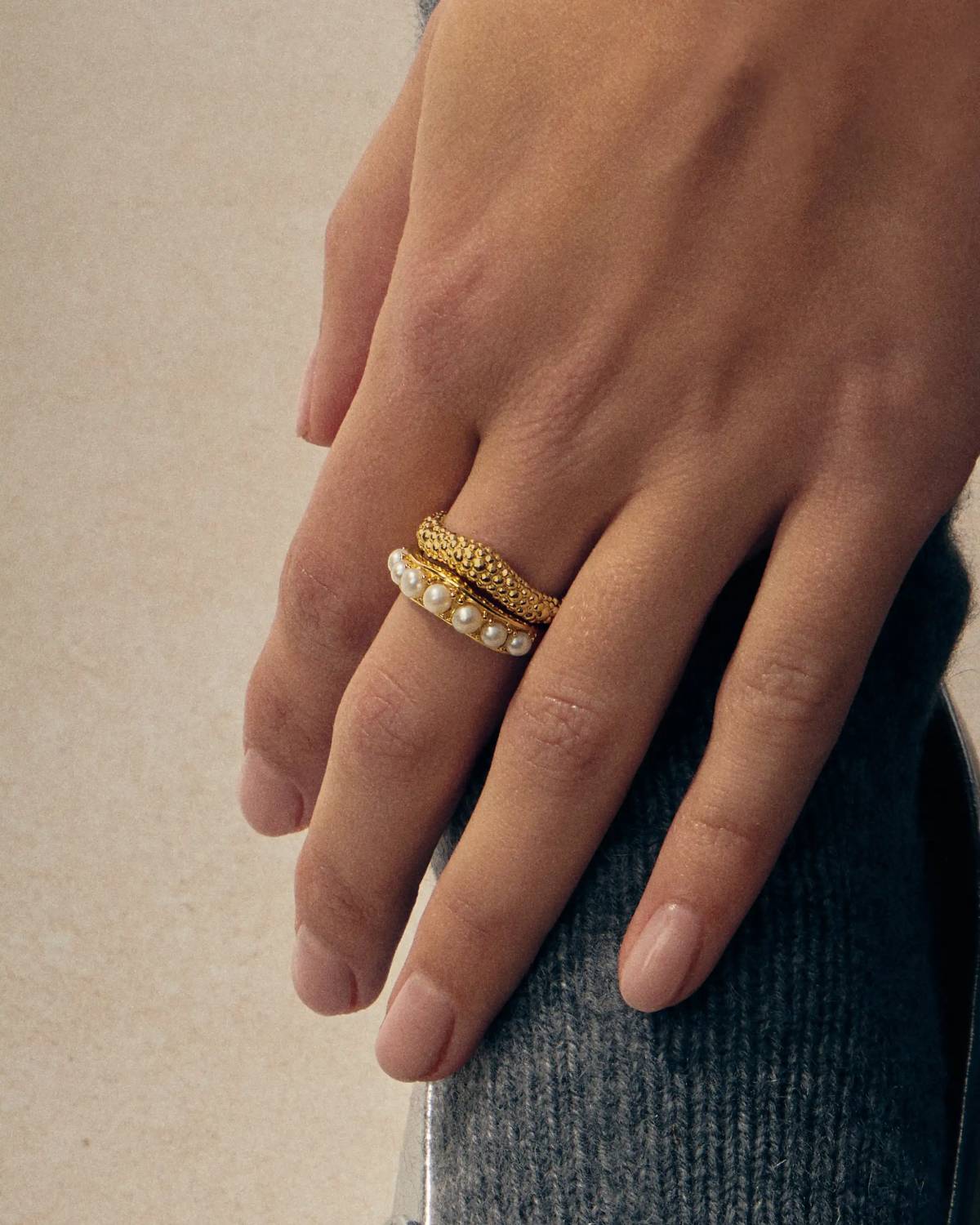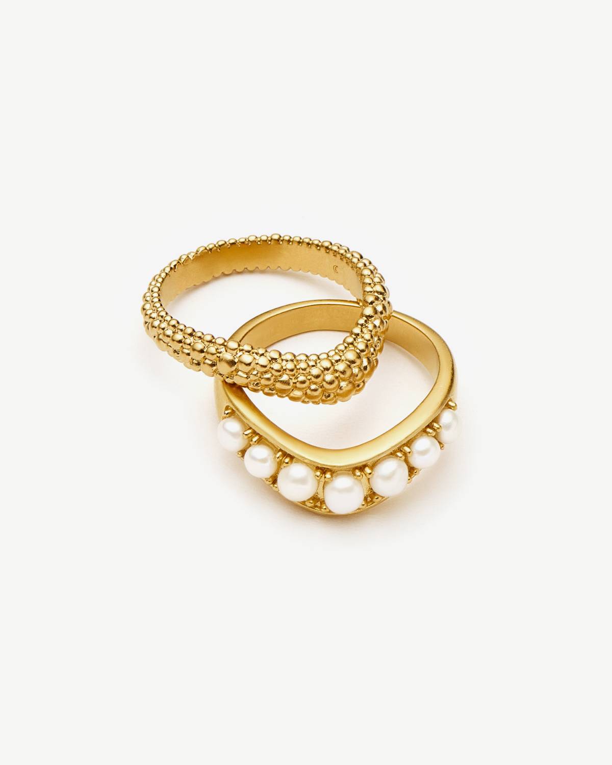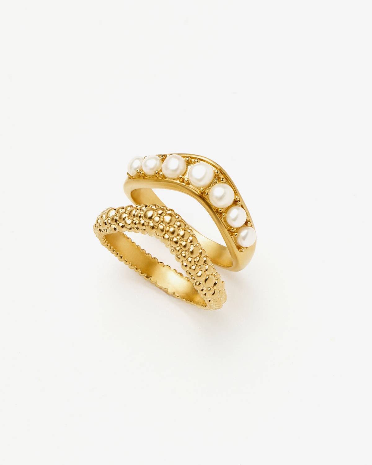 Stack it your way. The Pearl Baya Stacking Ring Set by Missoma combines textured details with luminous pearls on recycled 18ct gold. Two rings, endless styling possibilities — minimal worn alone, a true statement together. Modern, confident and full of glow. Your upgrade for every look.