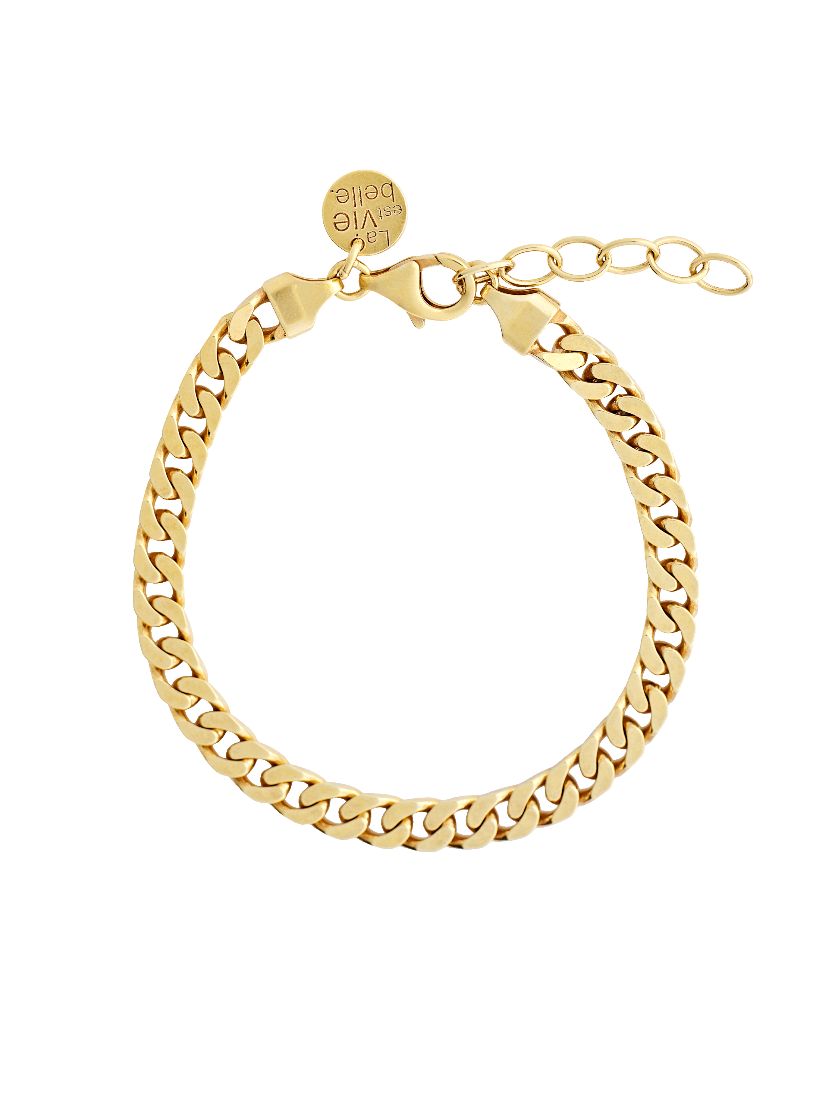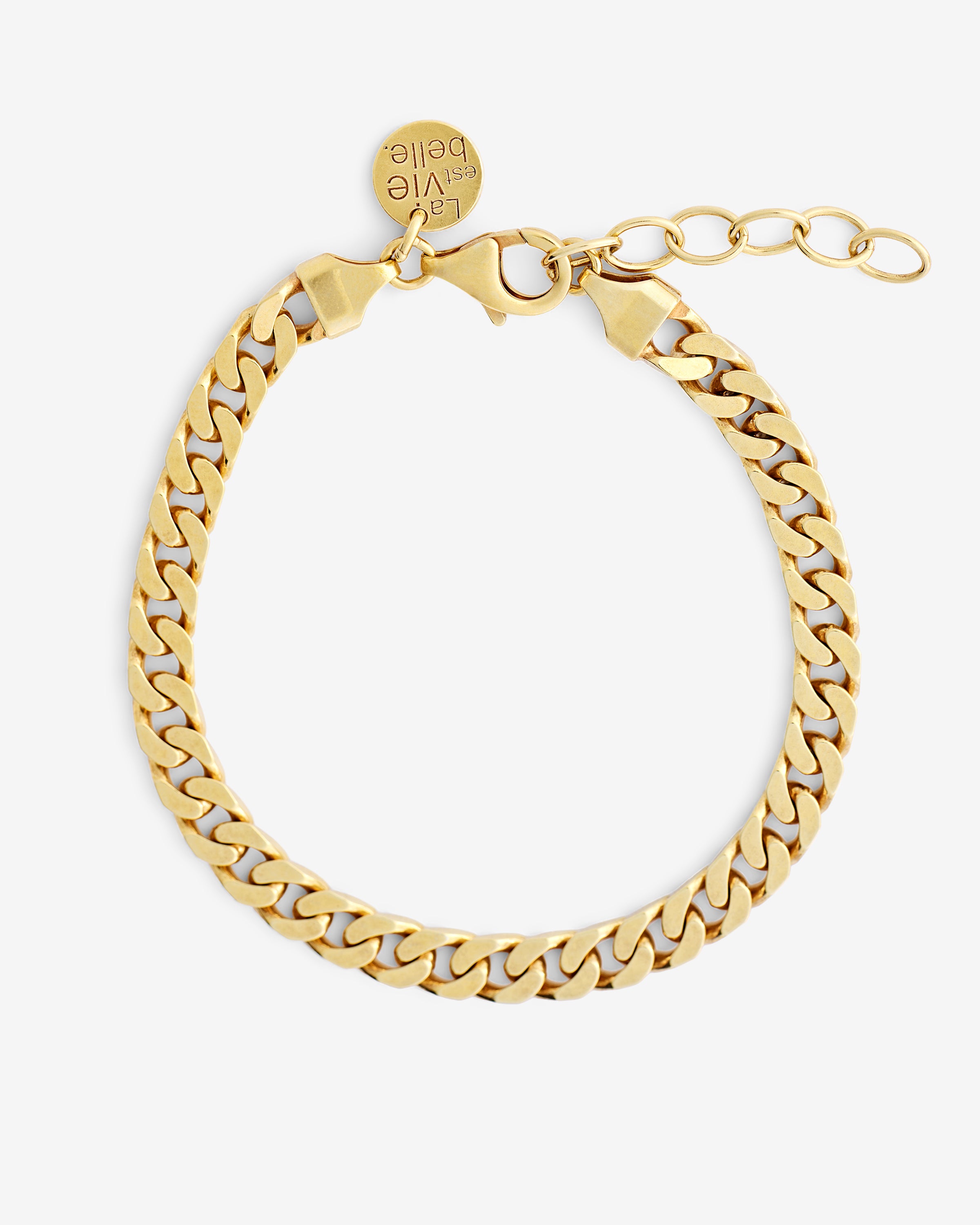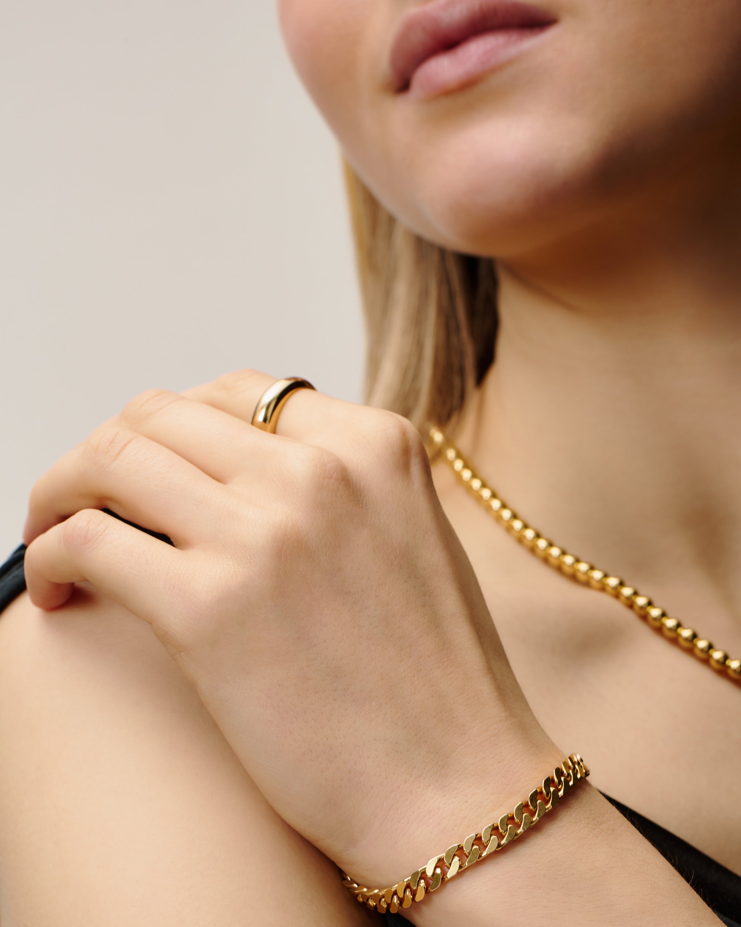 With simple yet powerful elegance, this Pompidou bracelet embraces the wrist. The curb chain made of high-quality sterling silver is plated with 18-karat gold and is waiting to be combined with other jewelry in the trendy chain layering. Especially in combination with other colors and textures, you can create exciting looks with this statement piece.