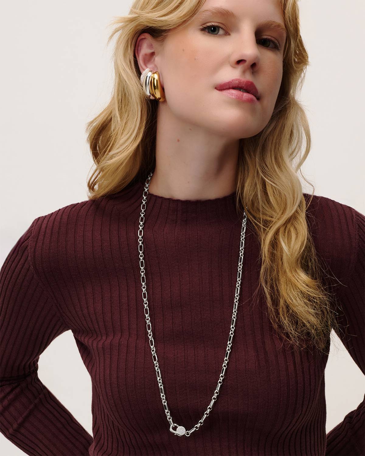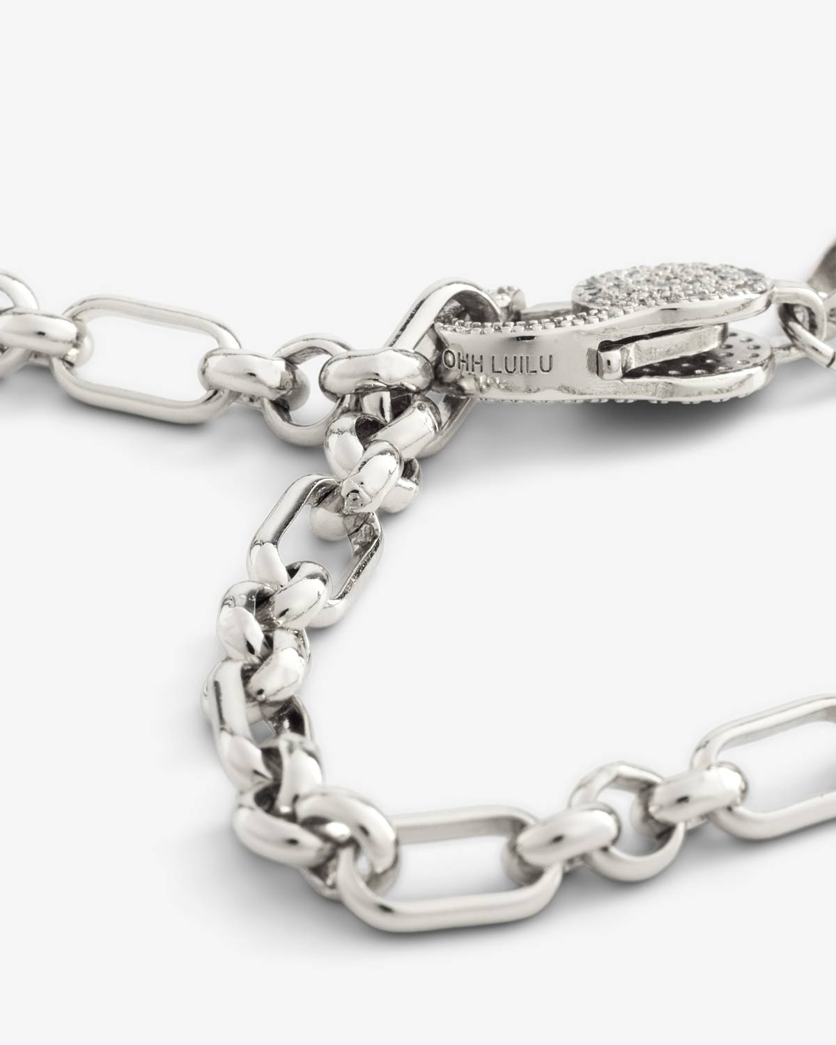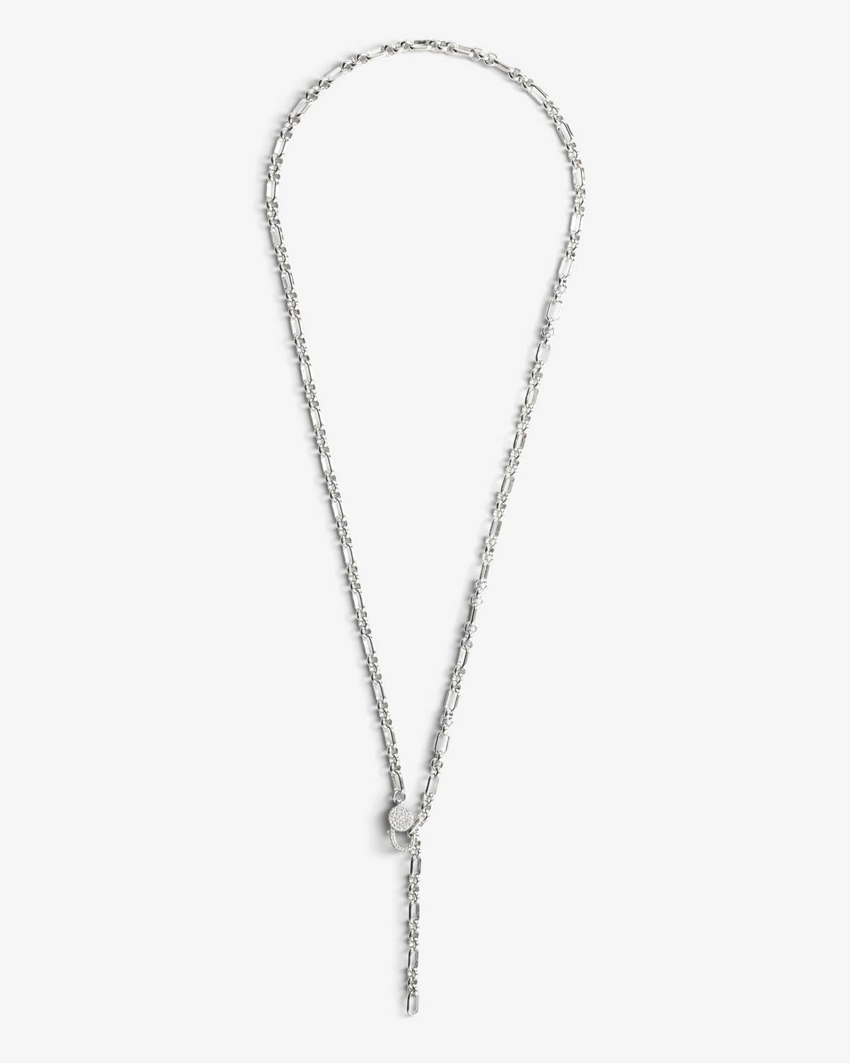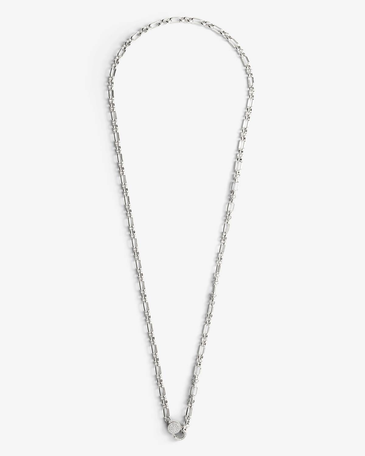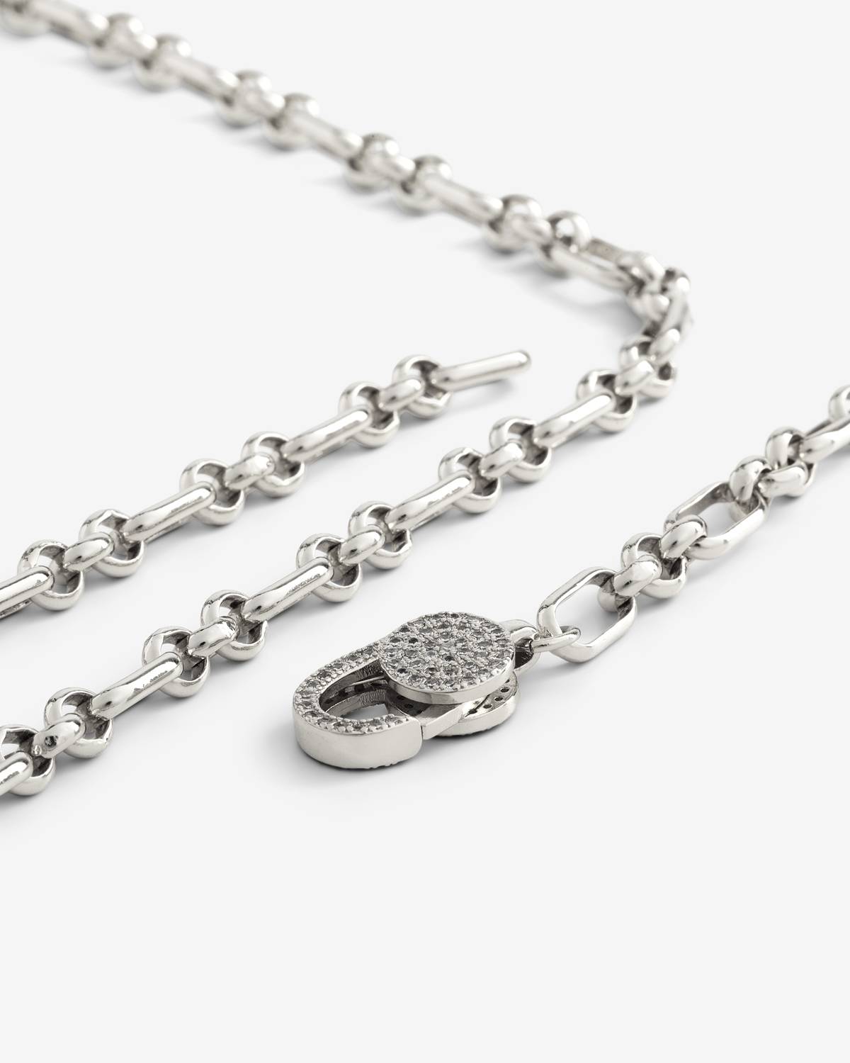 The Tiana Necklace in silver combines a modern chain design with a striking pavé zirconia detail in a lock shape. The cool silver finish emphasizes its clean lines and highlights the sparkle of the stones. An elegant statement piece with a modern twist.