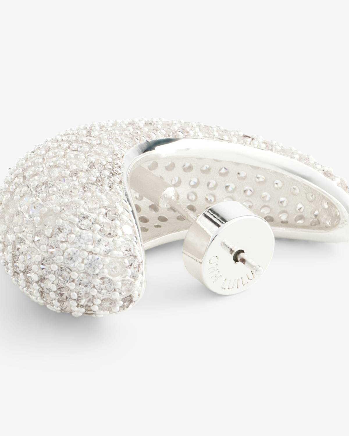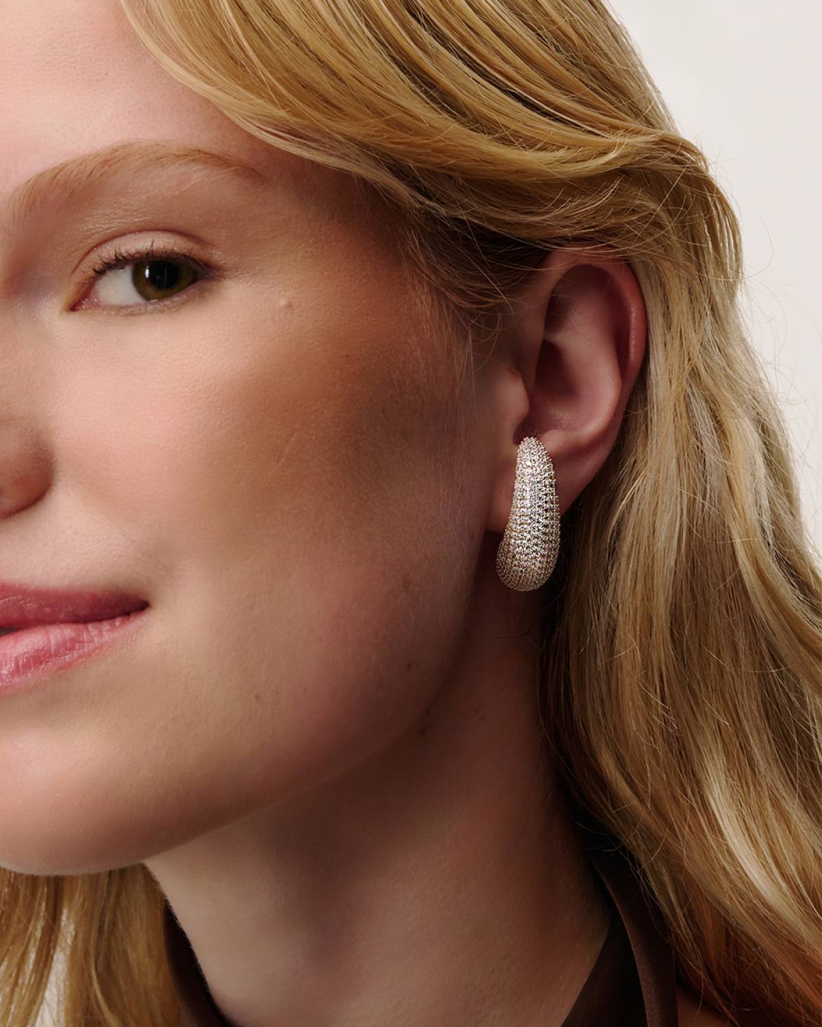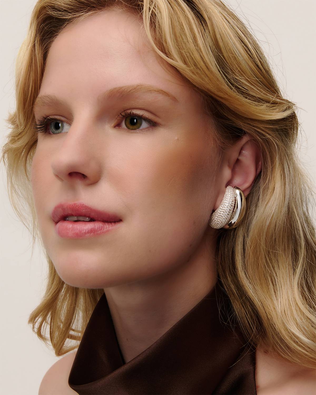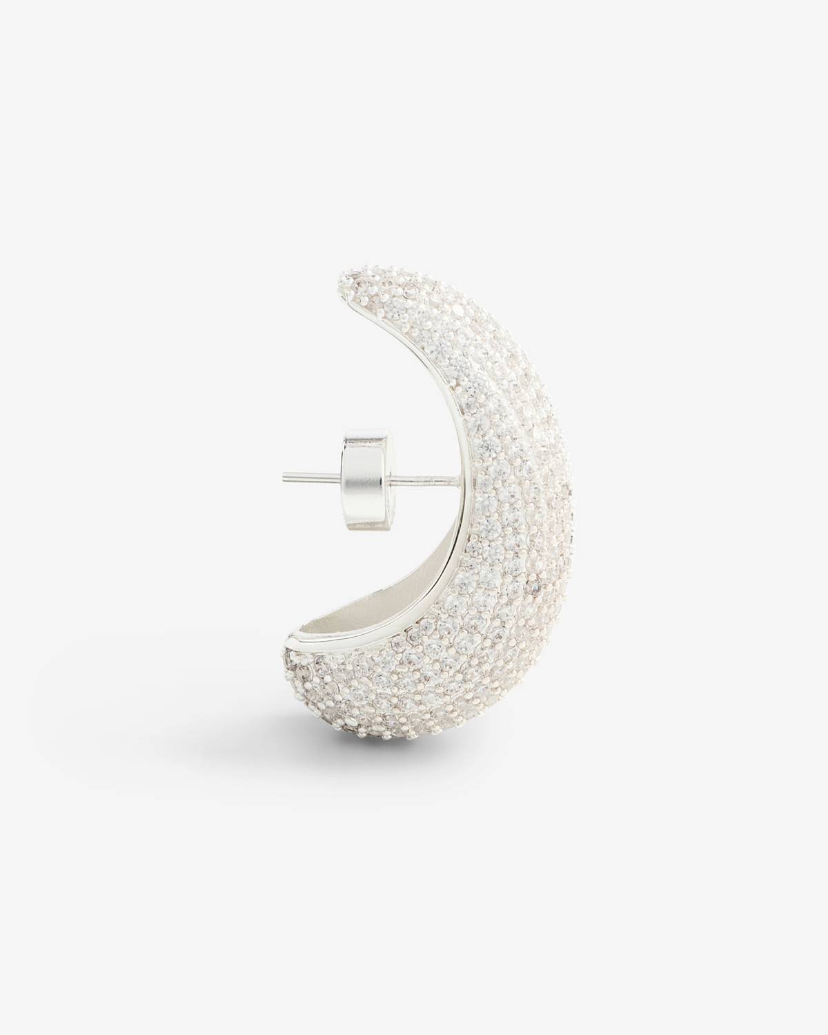 Der Amara Pavé Stud in Silber überzeugt mit seiner geschwungenen Form, die dicht an dicht mit weißen Pavé-Zirkonia besetzt ist. Das brillante Funkeln der Steine fängt das Licht aus jedem Winkel ein und verleiht dem Ohrstecker ein luxuriöses Strahlen.