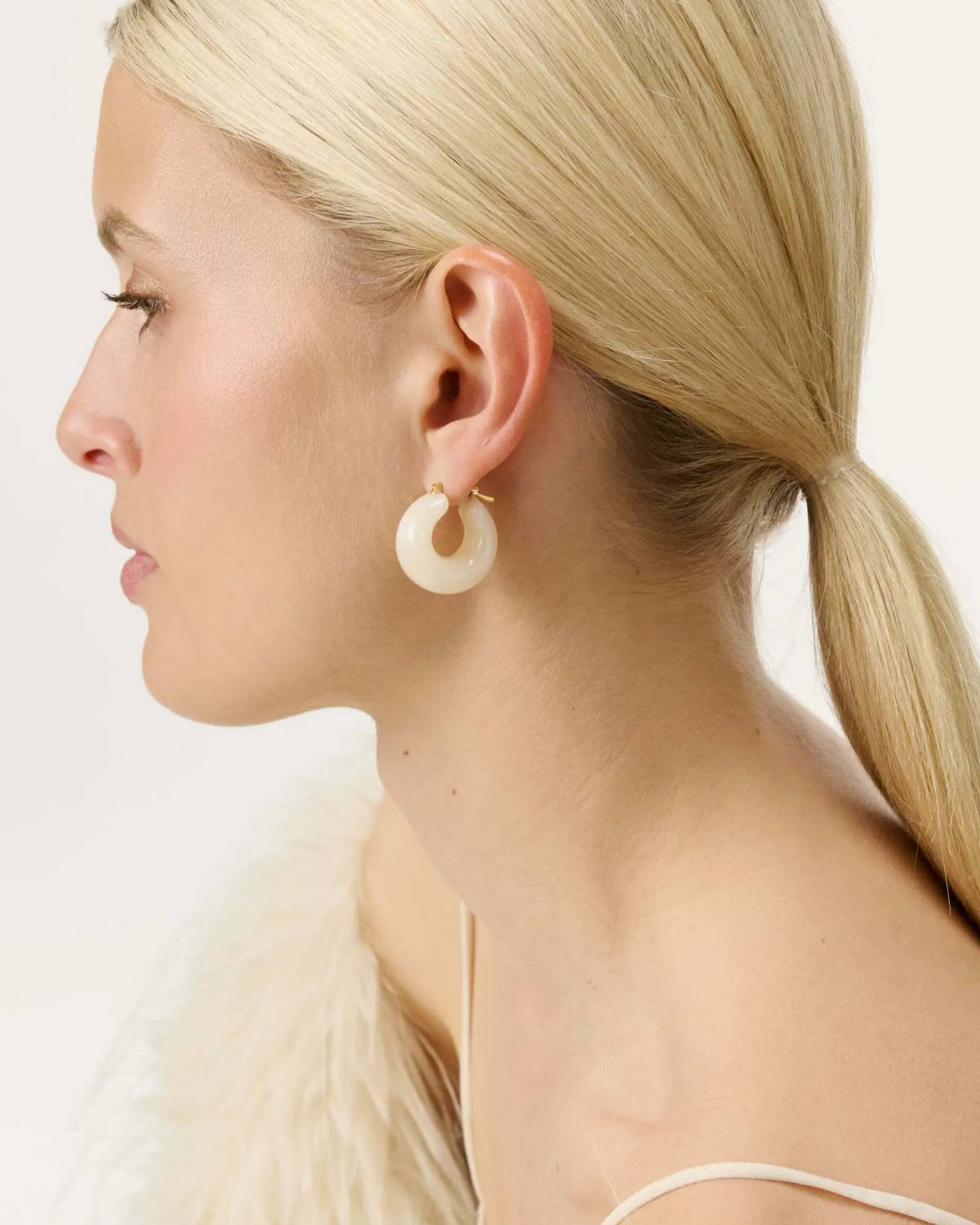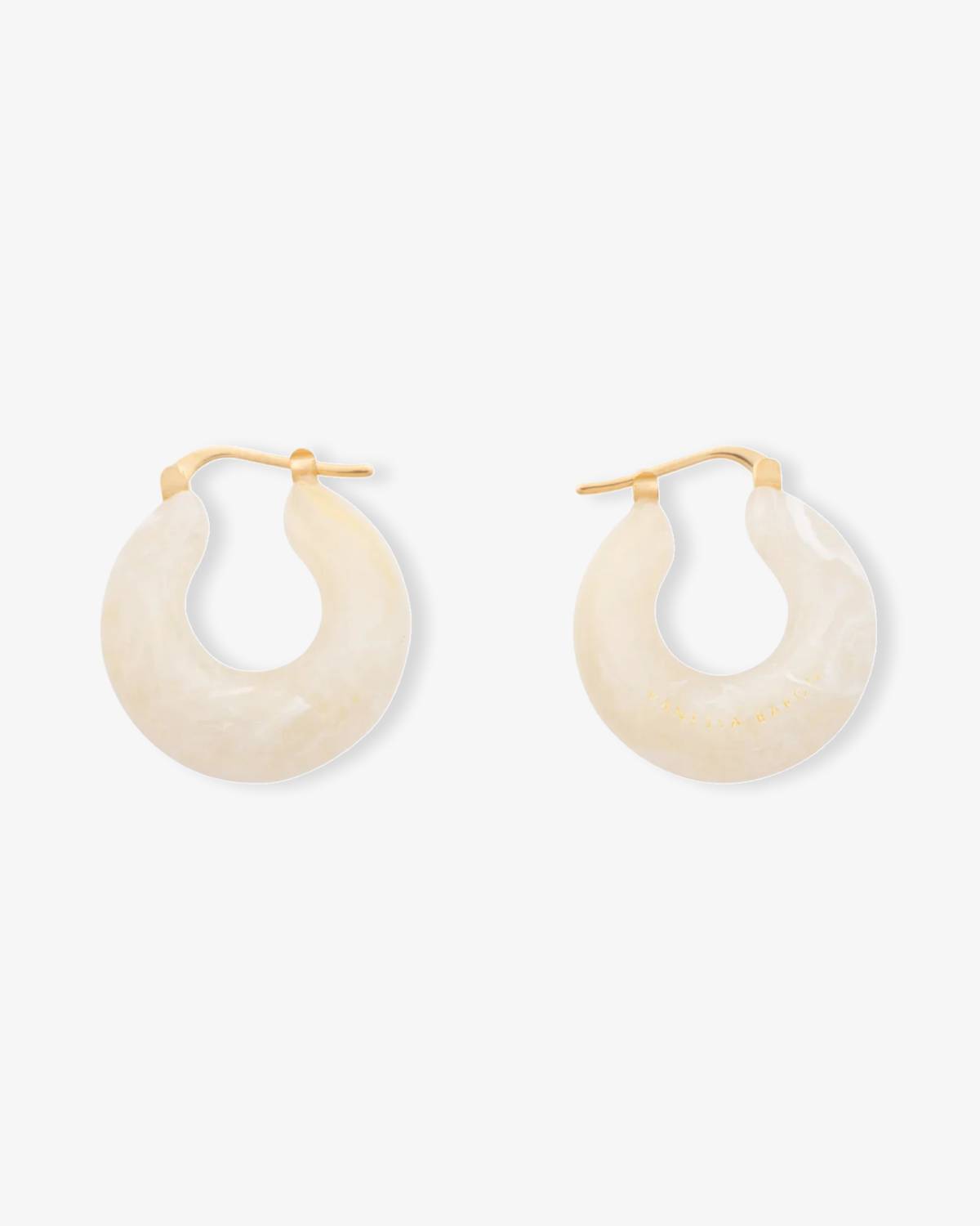 Der Vanessa Baroni Circlet Earring Pearl Marble überzeugt mit einer klaren Creolenform und einer sanften Marmor-Optik in hellem Perlmuttton. Die glatte Oberfläche verleiht dem Design eine moderne Leichtigkeit, während die gelb vergoldete Schließe einen warmen Akzent setzt. Leicht zu tragen und präzise verarbeitet, wirken die Creolen ausgewogen, trendbewusst und stilvoll modern.