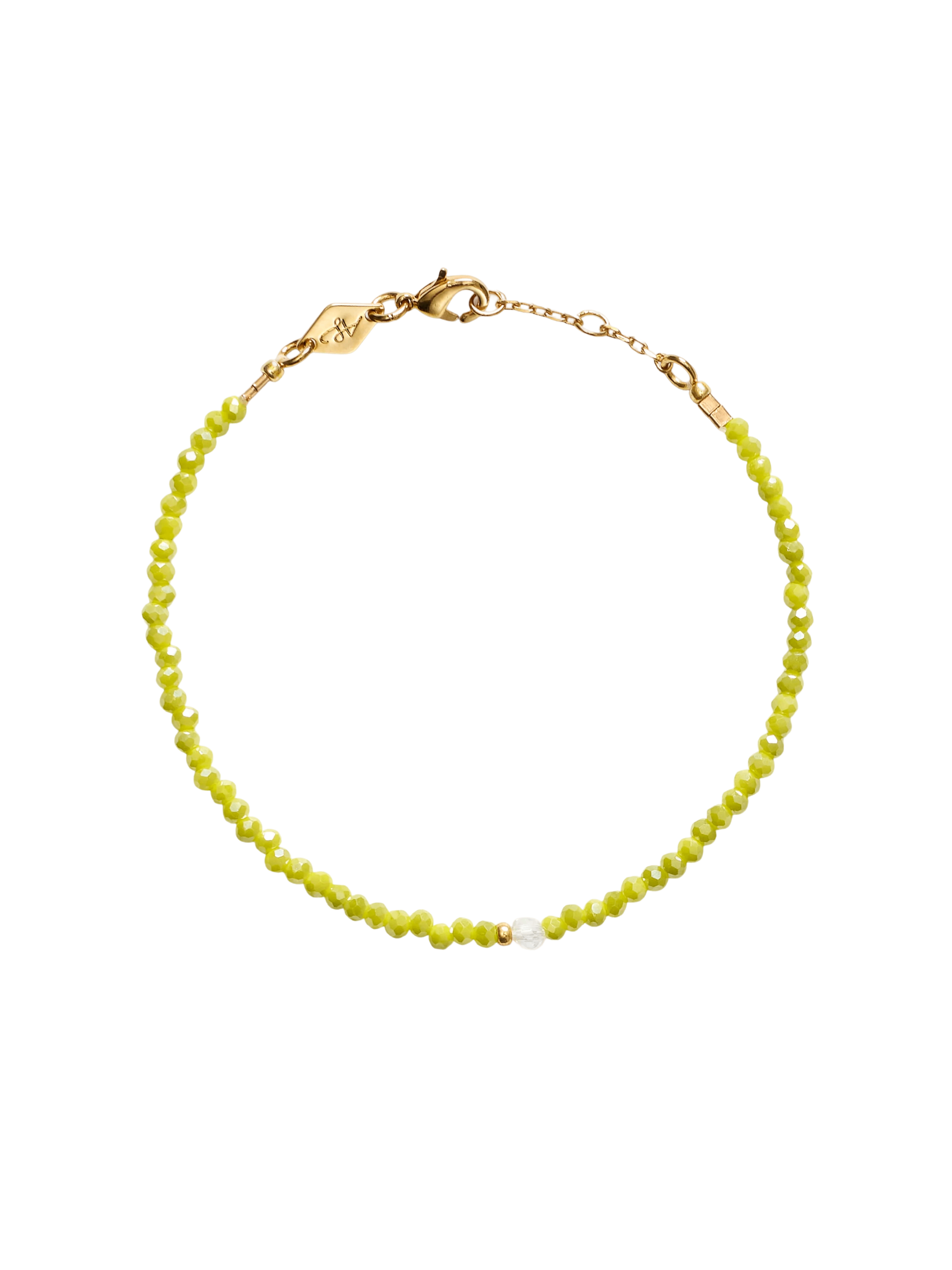 Go green, go glam! Das Cosmic Cactus Pale Olive Armband ist ein modernes Must-have mit olivefarbenen Glasperlen und funkelndem Kristall. 18kt vergoldete Details geben dem Piece den stylishen Chic – ein perfektes Accessoire für trendige Everyday-Looks und coole Layering-Styles.