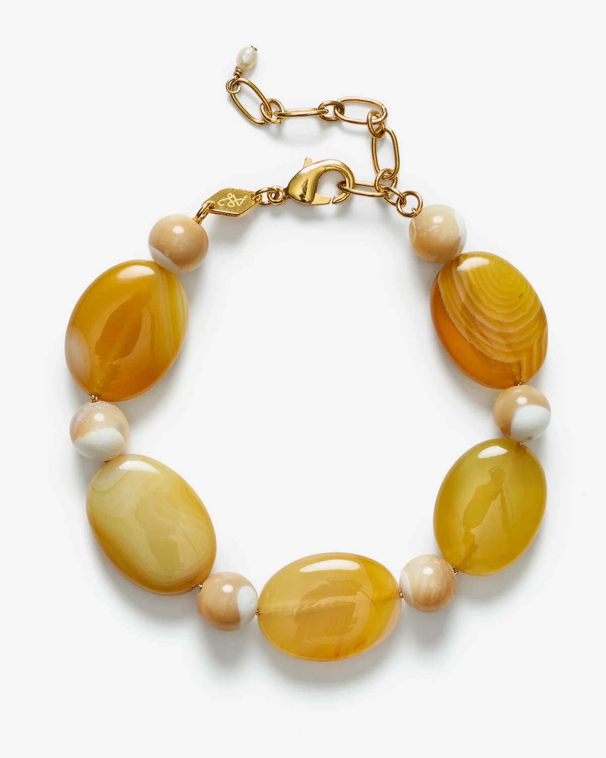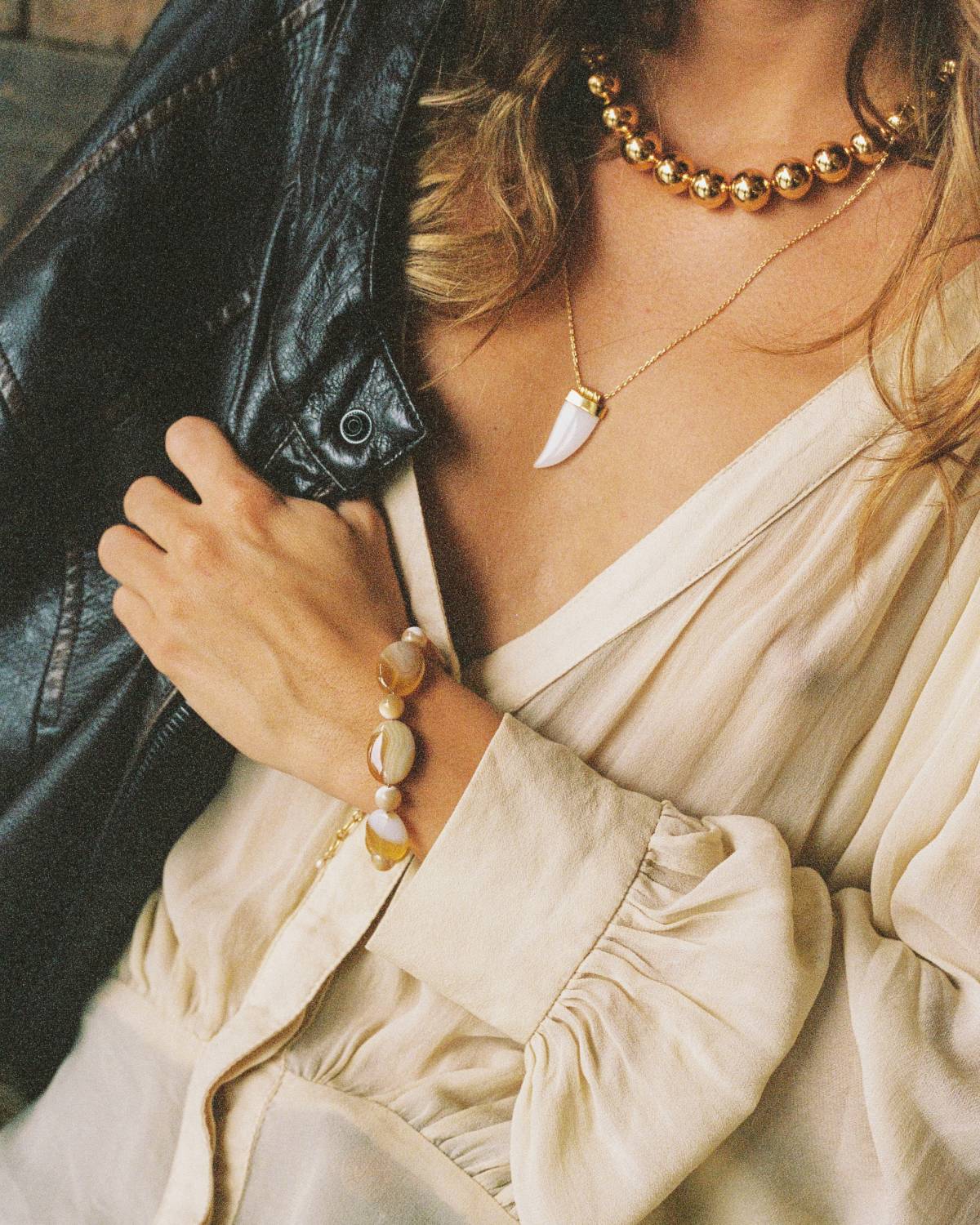 Das Desert Dreamer Butterscotch Armband zeigt, wie luxuriös Natürlichkeit sein kann: Jade, Mother of Pearl und Süßwasserperlen strahlen in warmen Tönen, veredelt durch 18kt vergoldete Akzente. Ein stilvolles Schmuckstück für zeitlose Eleganz.