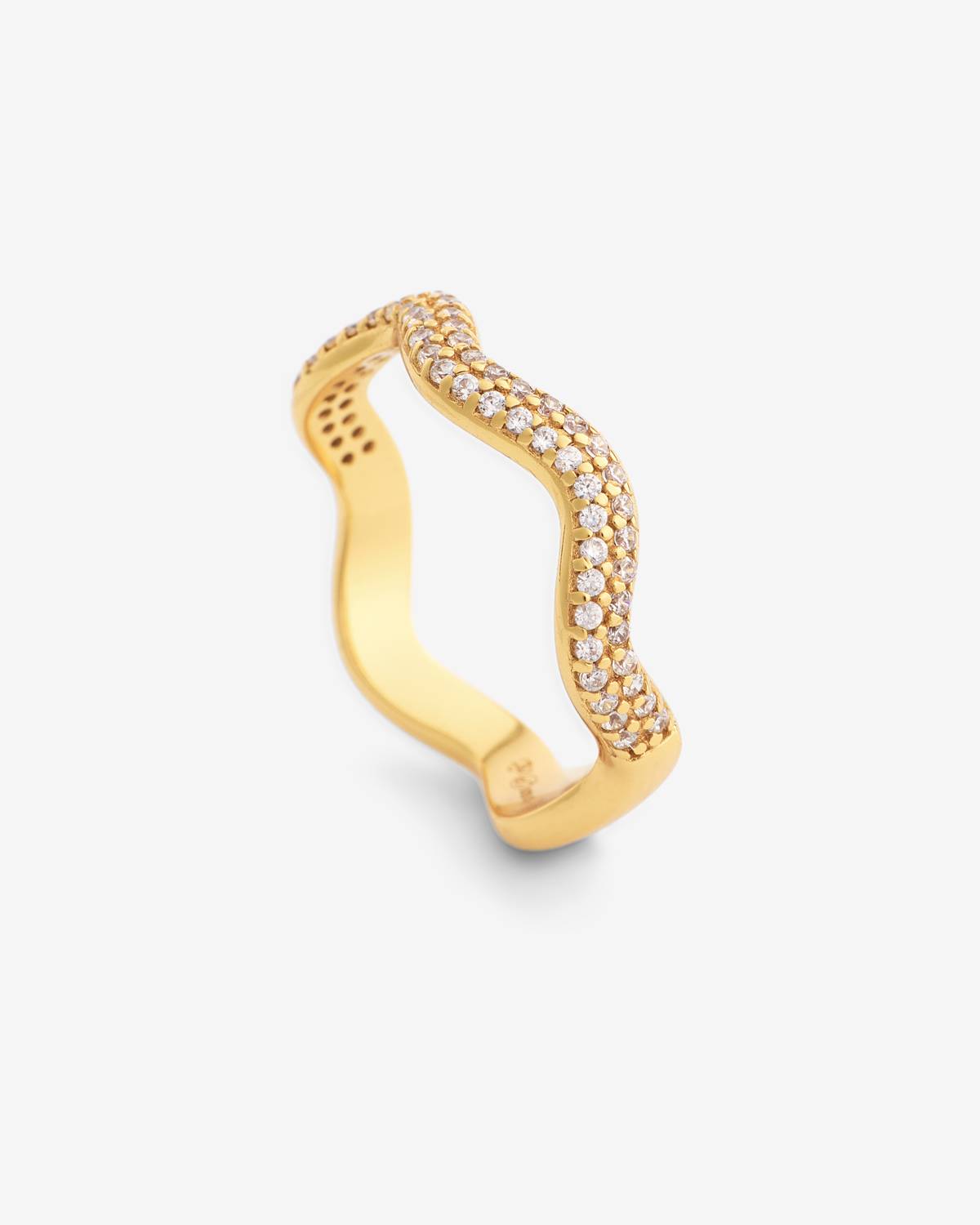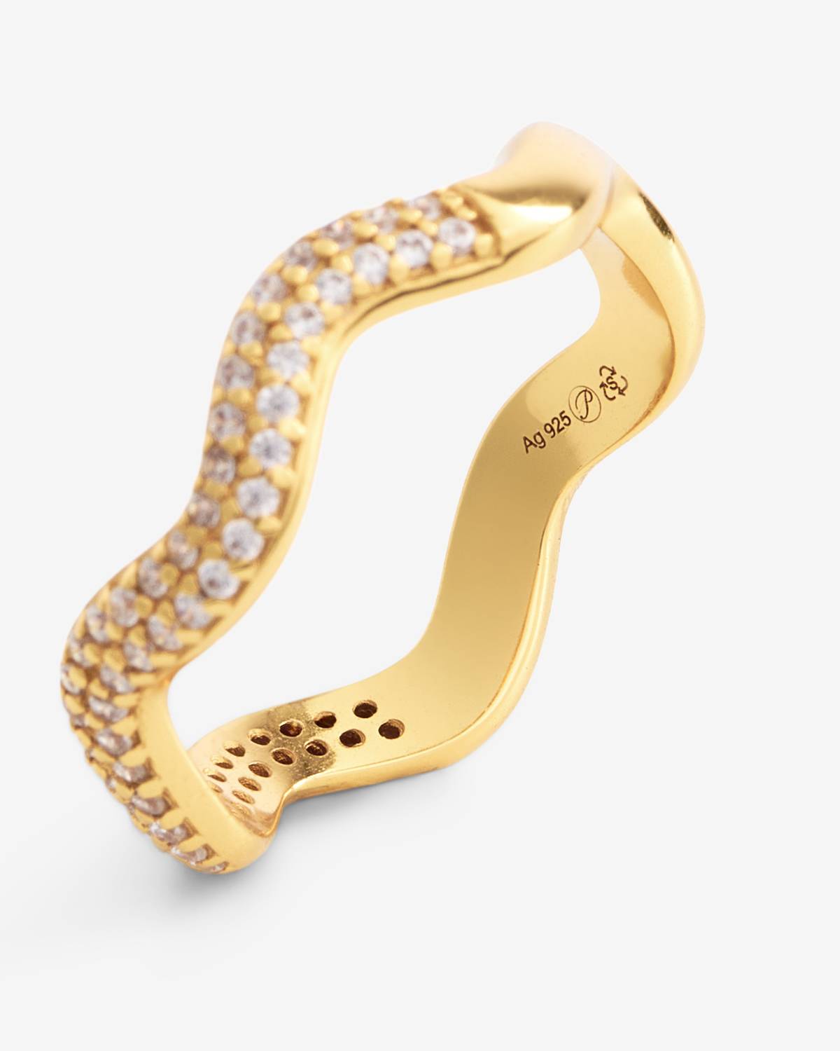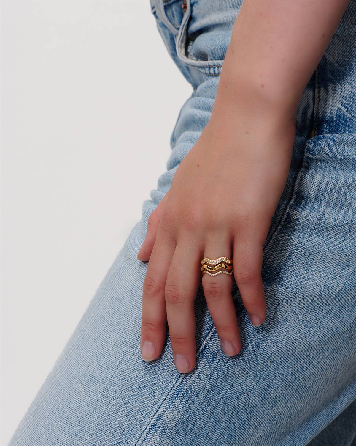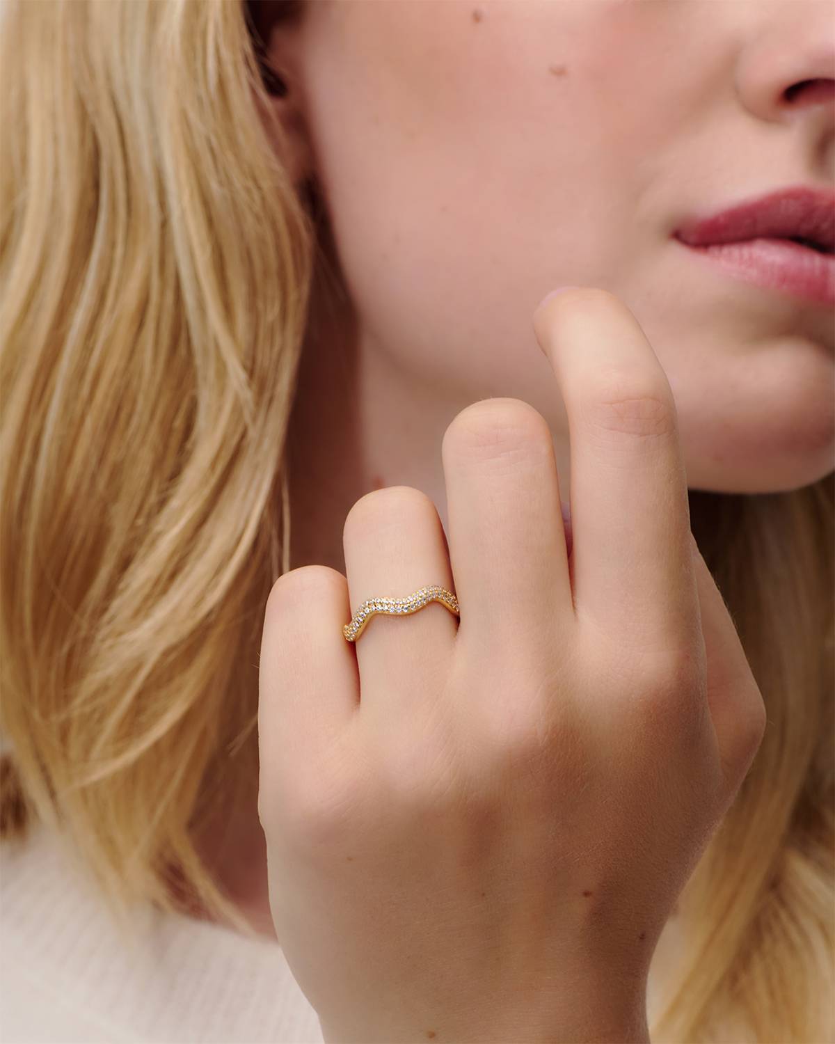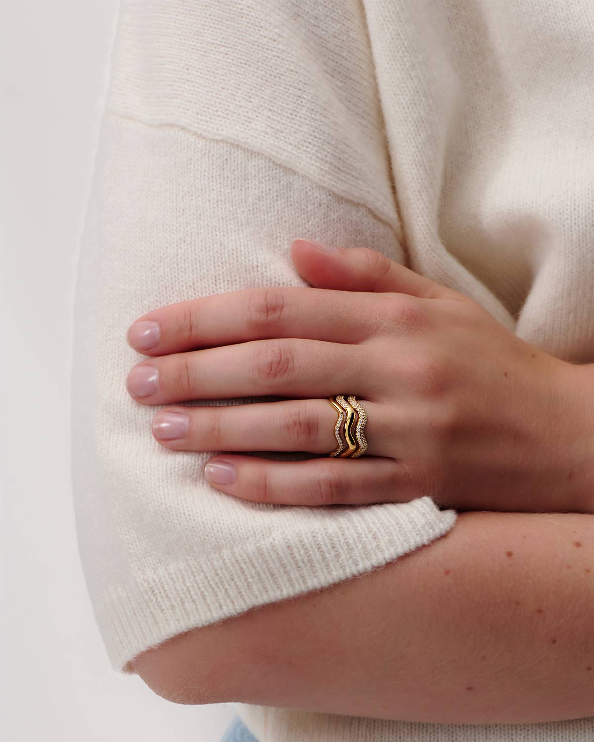 Juliette greift die Form fließender Bewegung auf – ein Ring in 18kt Vergoldung, besetzt mit White Zirconia, der modern und auffällig wirkt. Seine Wellenform bringt eine verspielte Note ins Styling und zeigt: Schmuck darf Spaß machen und gleichzeitig stark auftreten. Ein Piece für alle, die Individualität lieben.