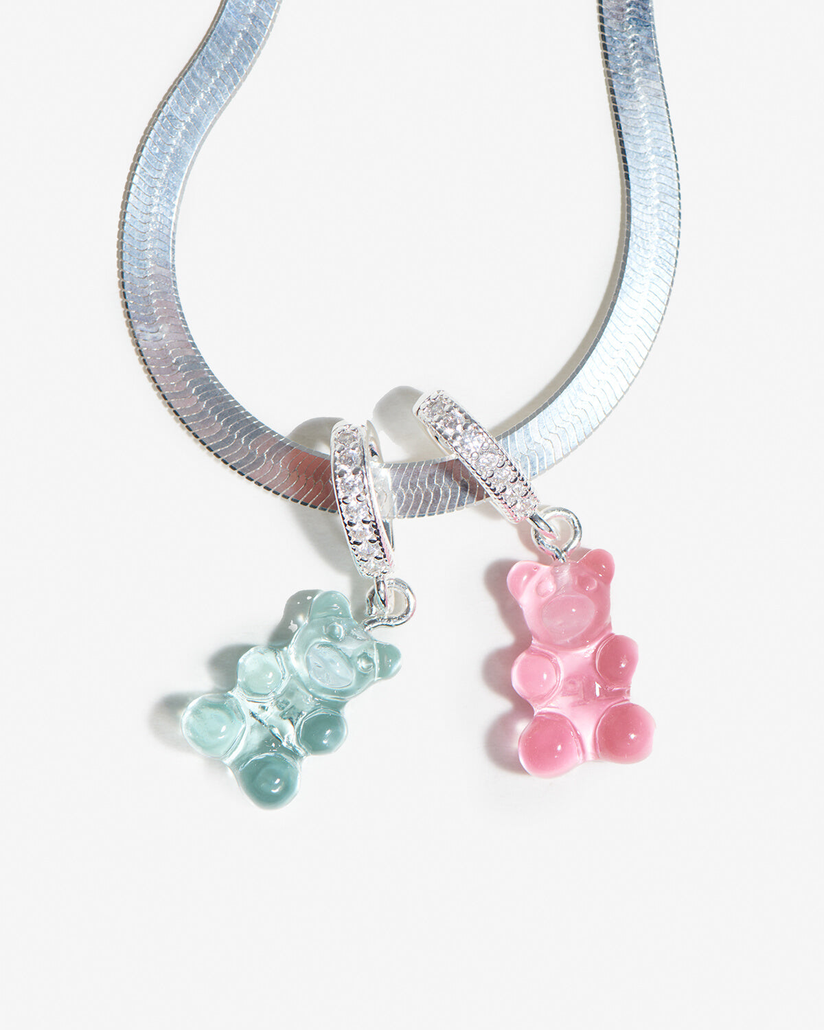 Dieser süße Kettenanhänger von Crystal Haze besticht durch das nostalgische Design eines Gummibärchens. Vielseitig kombinierbar, vervollständigt er jedes Outfit. Ob an Halsketten, Armbändern oder Fußkettchen getragen – die funkelnden Zirkoniasteine, das 925er versilberte Messing und das hochwertige Acetat machen ihn zu einem echten Hingucker.