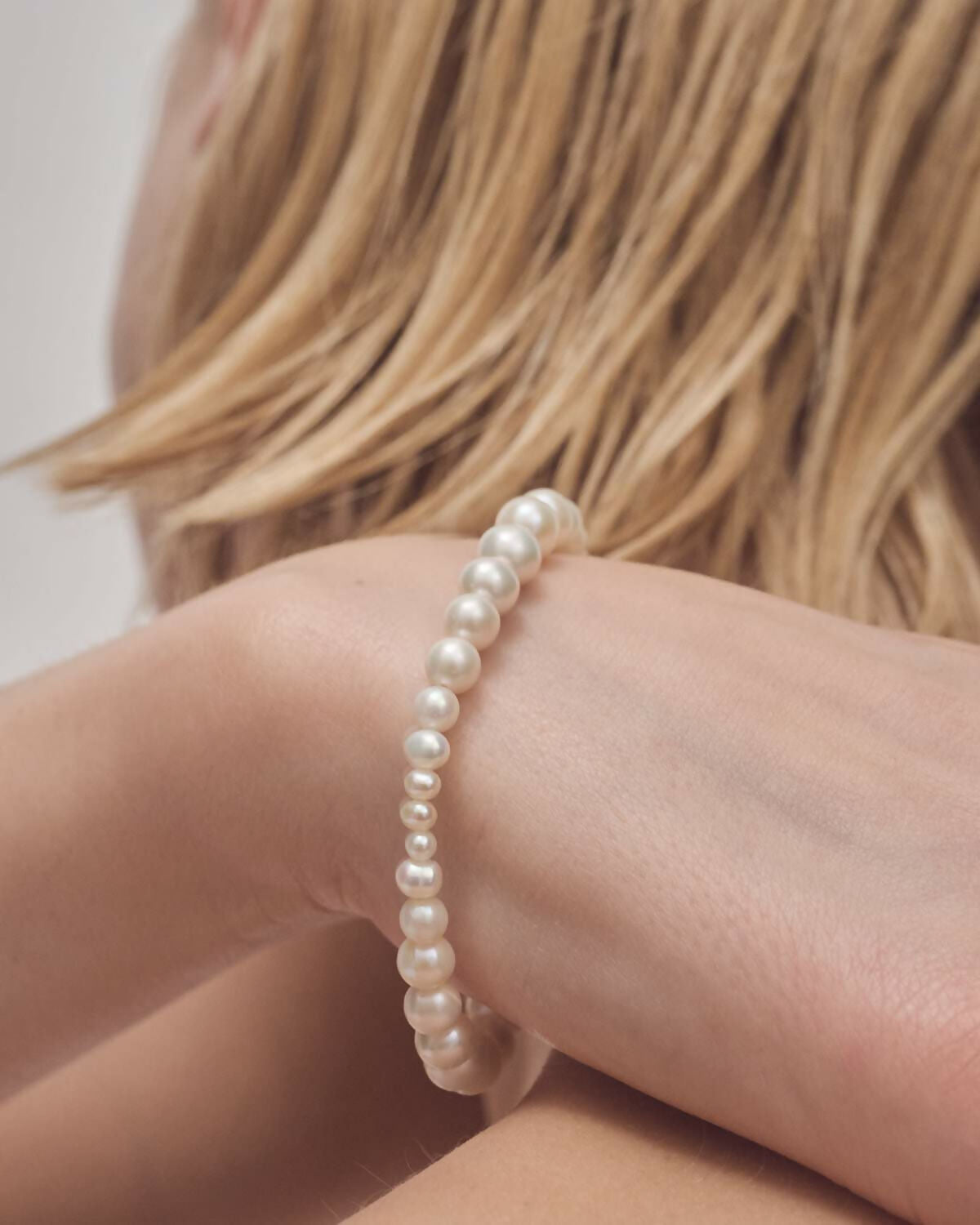 Ein echter Klassiker und zeitloses Schmuckstück mit verschiedenen Größen von Süßwasserperlen, die über Ihr Handgelenk tanzen.